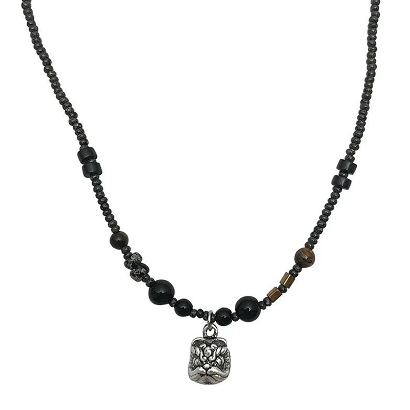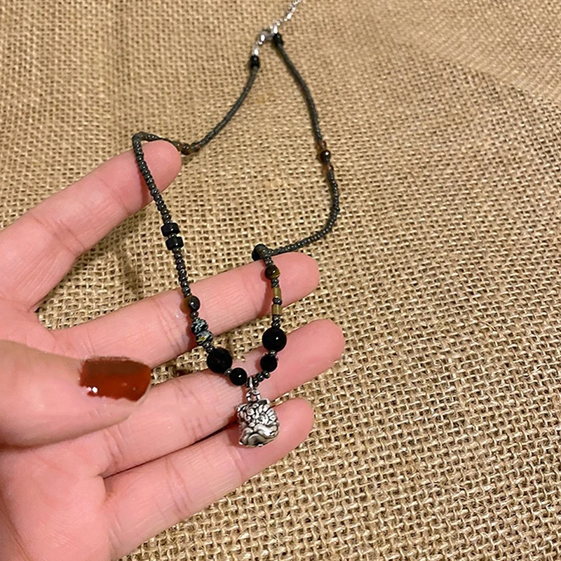 Vintage Chinese Style Lion Pendant Beaded Necklace For Women Men Lucky Punk Couple Clavicle Chain Ethnic Style Accessories